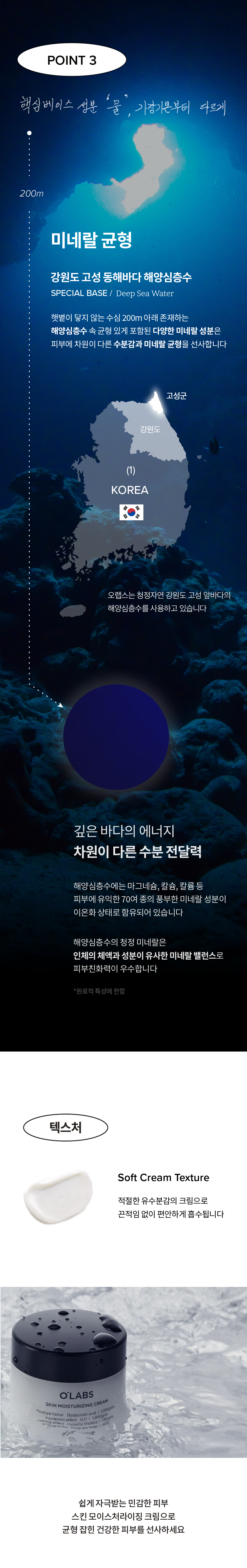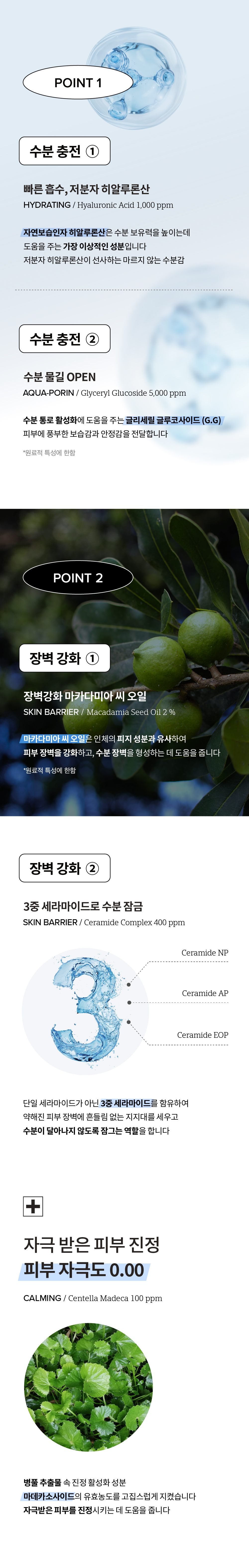 해수, 글리세린, 다이프로필렌글라이콜, 다이카프릴릴카보네이트, 하이드록시에틸우레아, 마카다미아씨오일, 락토바실러스/콩발효추출물, 효모/보리씨발효여과물, 락토바실러스/배즙발효여과물, 락토바실러스/석류발효추출물, 폴리글리세릴-3메틸글루코오스다이스테아레이트, 세테아릴올리베이트, 솔비탄올리베이트, 세테아릴알코올, 스테아릴알코올, 다이메티콘, 사이클로헥사실록세인, 트레할로오스, 다이메틸설폰, 부틸렌글라이콜, 프로판다이올, 사철쑥추출물, 올리브추출물, 1,2-헥산다이올, 병풀추출물, 마데카소사이드, 고삼뿌리추출물, 회화나무싹추출물, 글리세릴글루코사이드, 폴리하이드록시스테아릭애씨드, C14-22알코올, C12-20알킬글루코사이드, 비사보롤, 옥틸도데칸올, 에키움 플란타기네움씨오일, 해바라기씨오일불검화물, 풍선덩굴꽃/잎/덩굴추출물, 토코페롤, 소듐하이알루로네이트, 아크릴레이트/C10-30알킬아크릴레이트크로스폴리머, 세라마이드엔피, 세라마이드에이피, 세라마이드이오피, 피토스핑고신, 콜레스테롤, 소듐라우로일락틸레이트, 잔탄검, 알지닌, 판테놀, 다이포타슘글리시리제이트, 말라카이트추출물, 소듐폴리아크릴레이트, 사발팜열매추출물, 참깨오일, 아르간커넬오일, 베타-시토스테롤