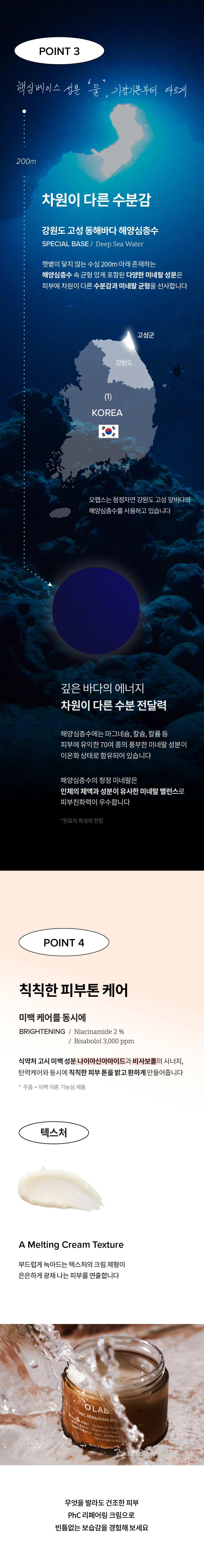 해수, 글리세린, 부틸렌글라이콜, 다이카프릴릴카보네이트, 부틸렌글라이콜다이카프릴레이트/다이카프레이트, 세틸알코올, 하이드로제네이티드폴리데센, 세틸에틸헥사노에이트, 다이메티콘, 나이아신아마이드, 락토바실러스/콩발효추출물, 효모/보리씨발효여과물, 락토바실러스/배즙발효여과물, 락토바실러스/석류발효추출물, 세라마이드엔피, 세라마이드에이피, 세라마이드이오피, 피토스핑고신, 콜레스테롤, 소듐라우로일락틸레이트, 잔탄검, 에델바이스캘러스배양추출물, 사과세포배양추출물, 포도세포추출물, 폴리하이드록시스테아릭애씨드, 하이드로제네이티드식물성오일, 다이메틸설폰, 하이드롤라이즈드호밀피토플라센타추출물, 병풀추출물, 마데카소사이드, 고삼뿌리추출물, 회화나무싹추출물, 글리세릴글루코사이드, 카퍼트라이펩타이드-1, 프로판다이올, 사철쑥추출물, 올리브추출물, 1,2-헥산다이올, 스테비아잎추출물, C14-22알코올, C12-20알킬글루코사이드, 폴리글리세릴-3메틸글루코오스다이스테아레이트, 옥틸도데칸올, 에키움 플란타기네움씨오일, 해바라기씨오일불검화물, 풍선덩굴꽃/잎/덩굴추출물, 토코페롤, 소듐아크릴레이트코폴리머, 레시틴, 비사보롤, 라벤더오일, 베르가모트오일, 비터오렌지꽃오일, 소듐폴리아크릴레이트, 소듐하이알루로네이트, 알로에베라잎즙가루, 알란토인, 판테놀, 아크릴레이트/C10-30알킬아크릴레이트크로스폴리머, 다이포타슘글리시리제이트, 아데노신, 알지닌, 하이드롤라이즈드피브로인